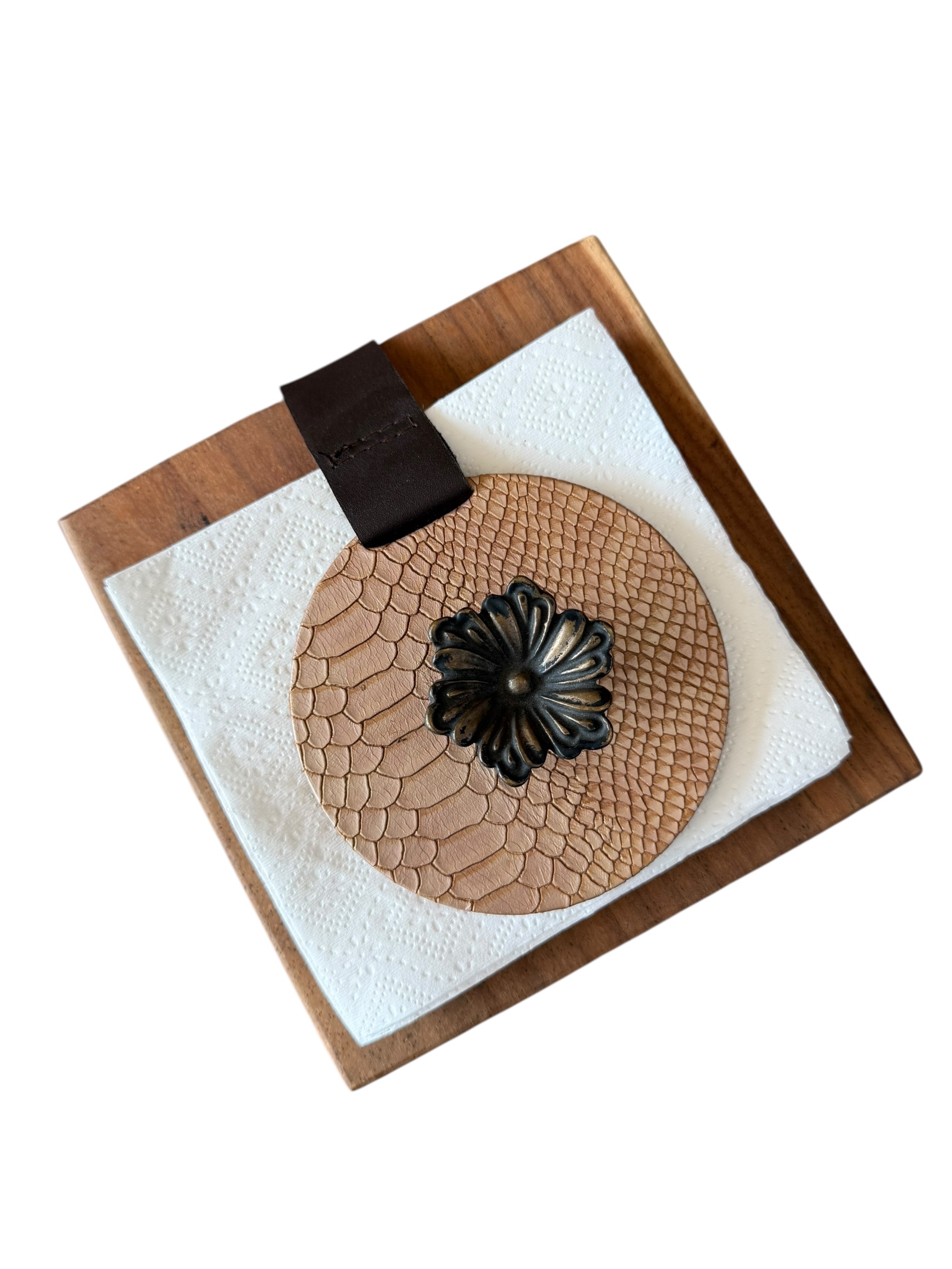 Servilletero en parota, drilo cobre con herraje de flor