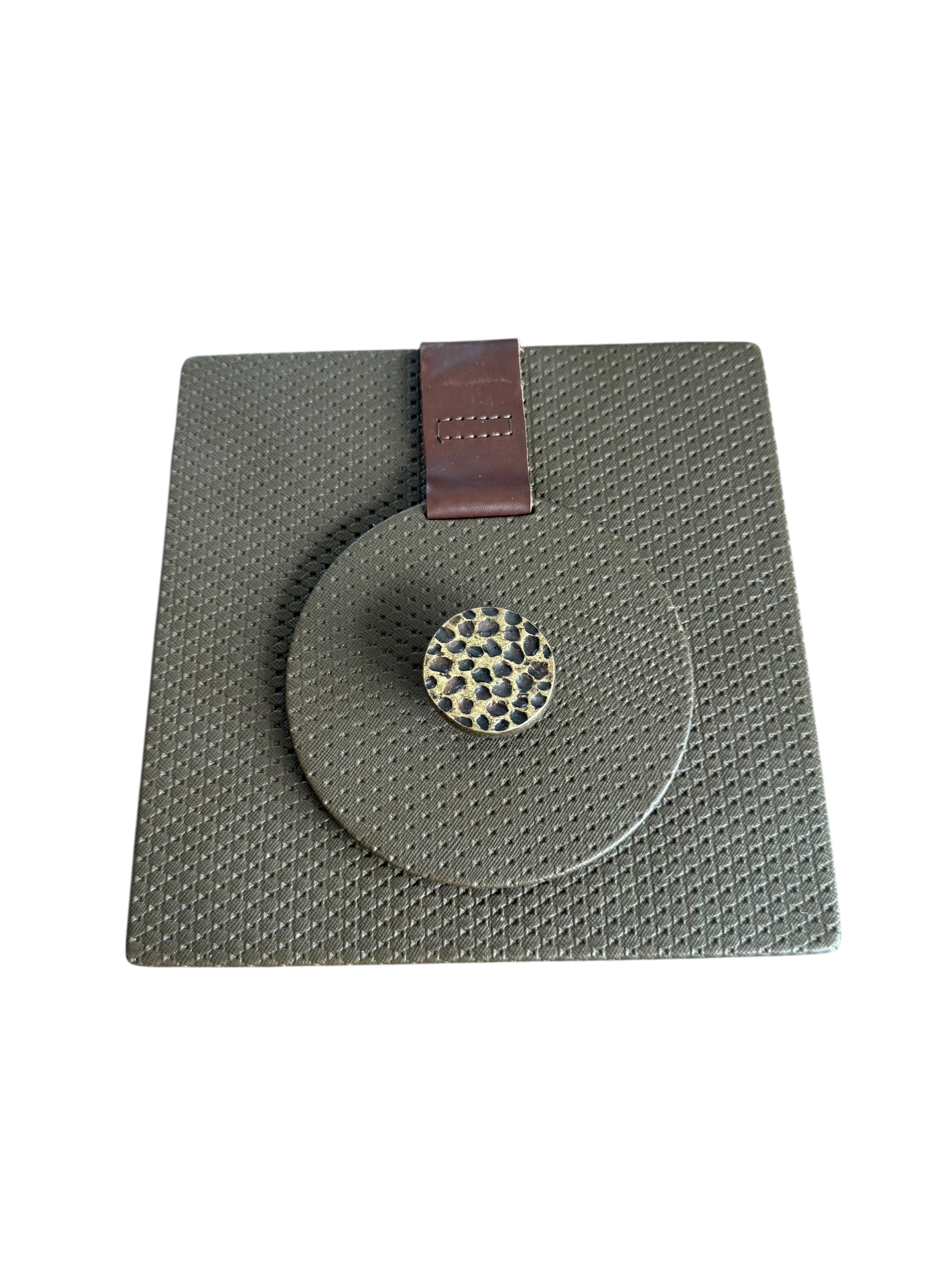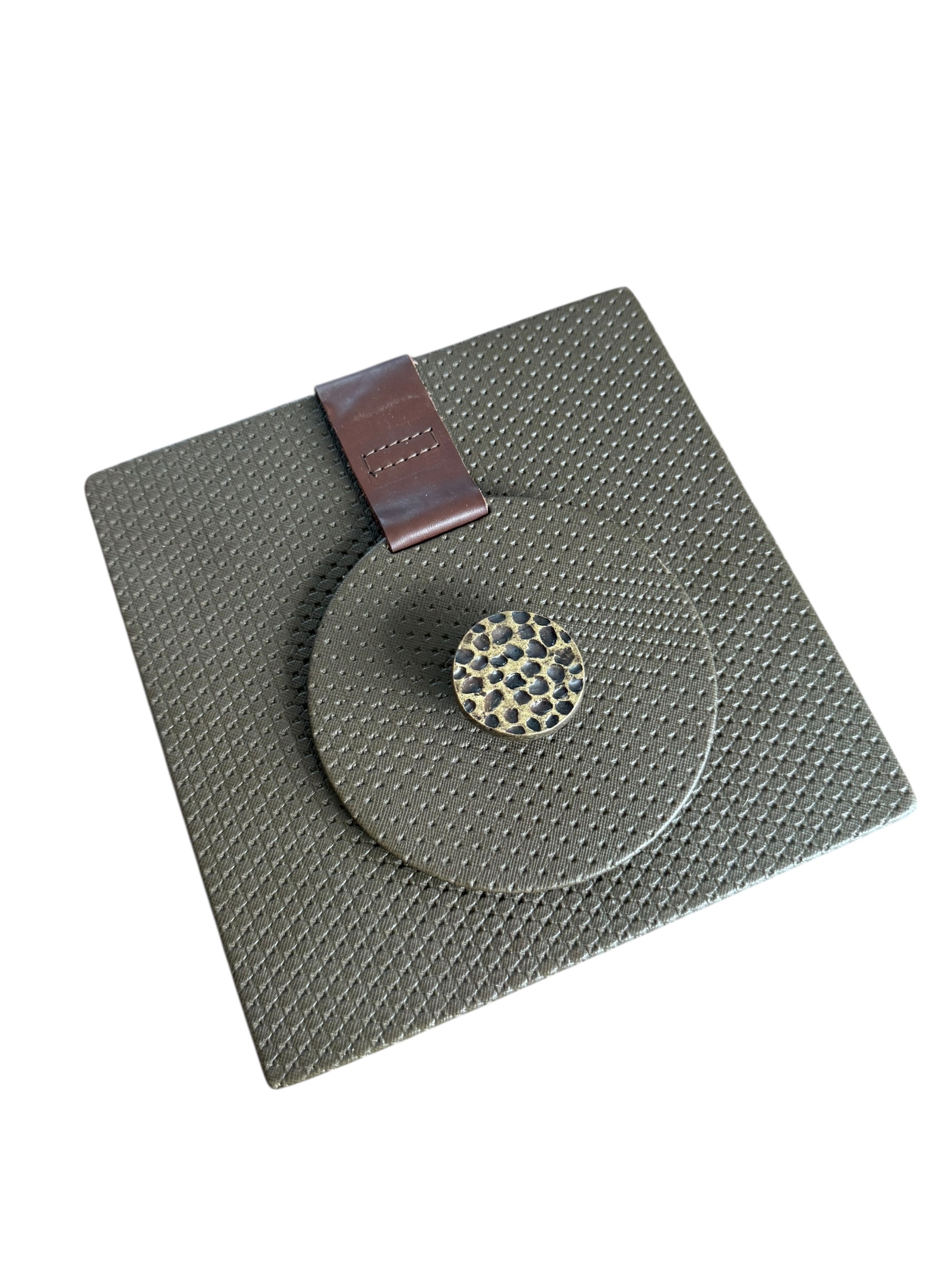 Servilletero madera, forrado en drilo café con herraje nuez