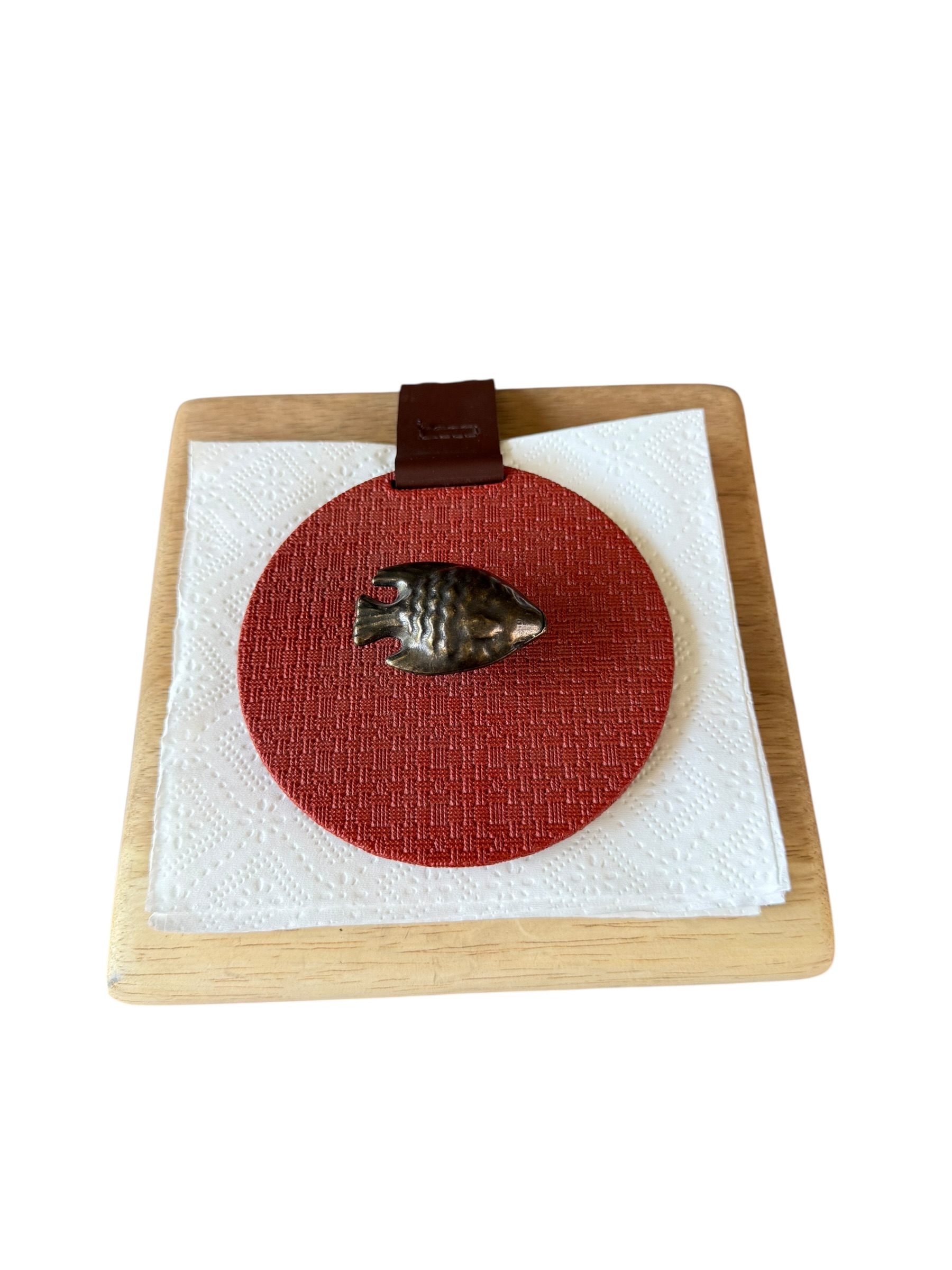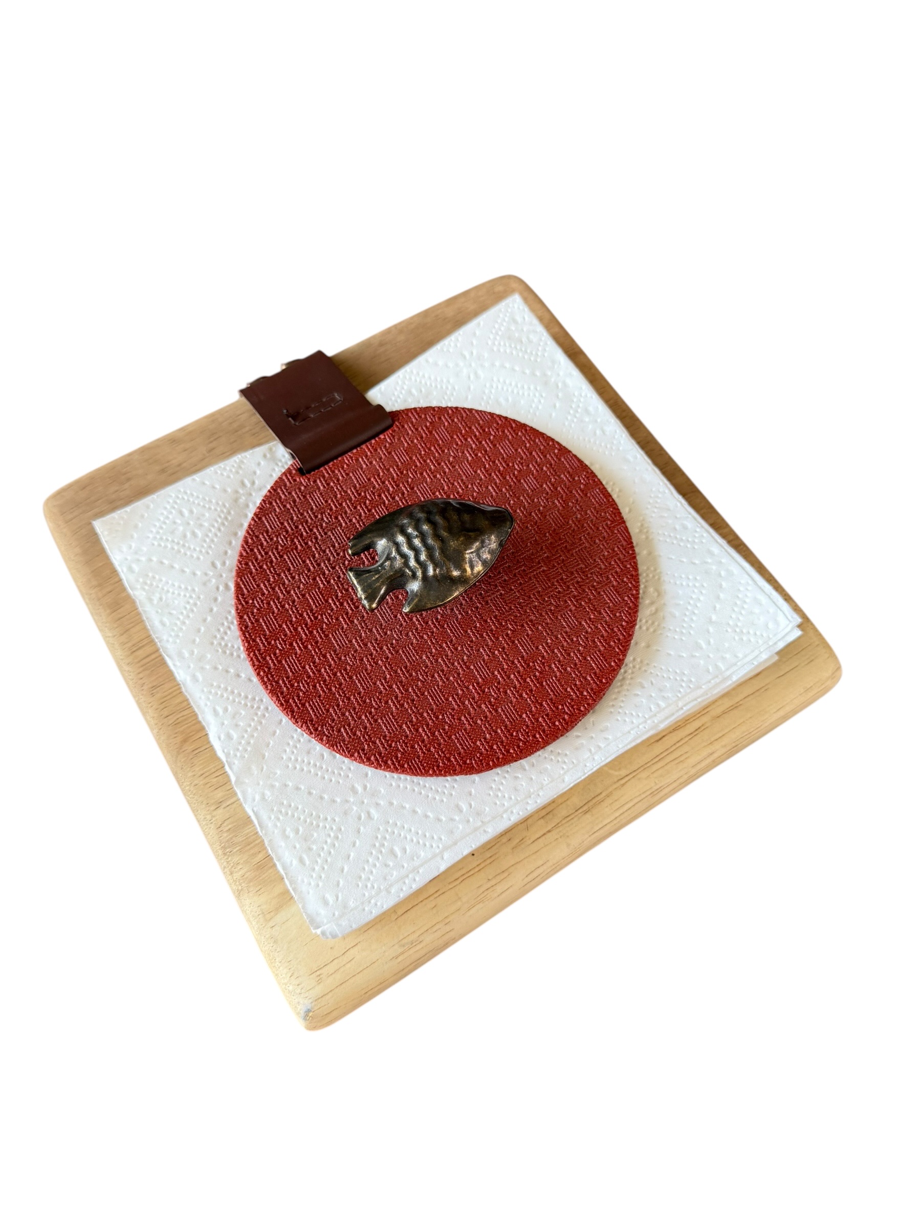 Servilletero en parota, liso rojo con herraje de pez ángel